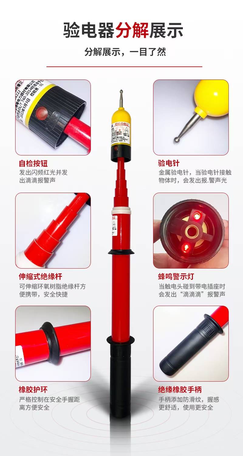 高压验电器: 绝缘杆(可伸缩)、验电头(含电场传感器)、声光报警模块、电池(部分需自检功能)。