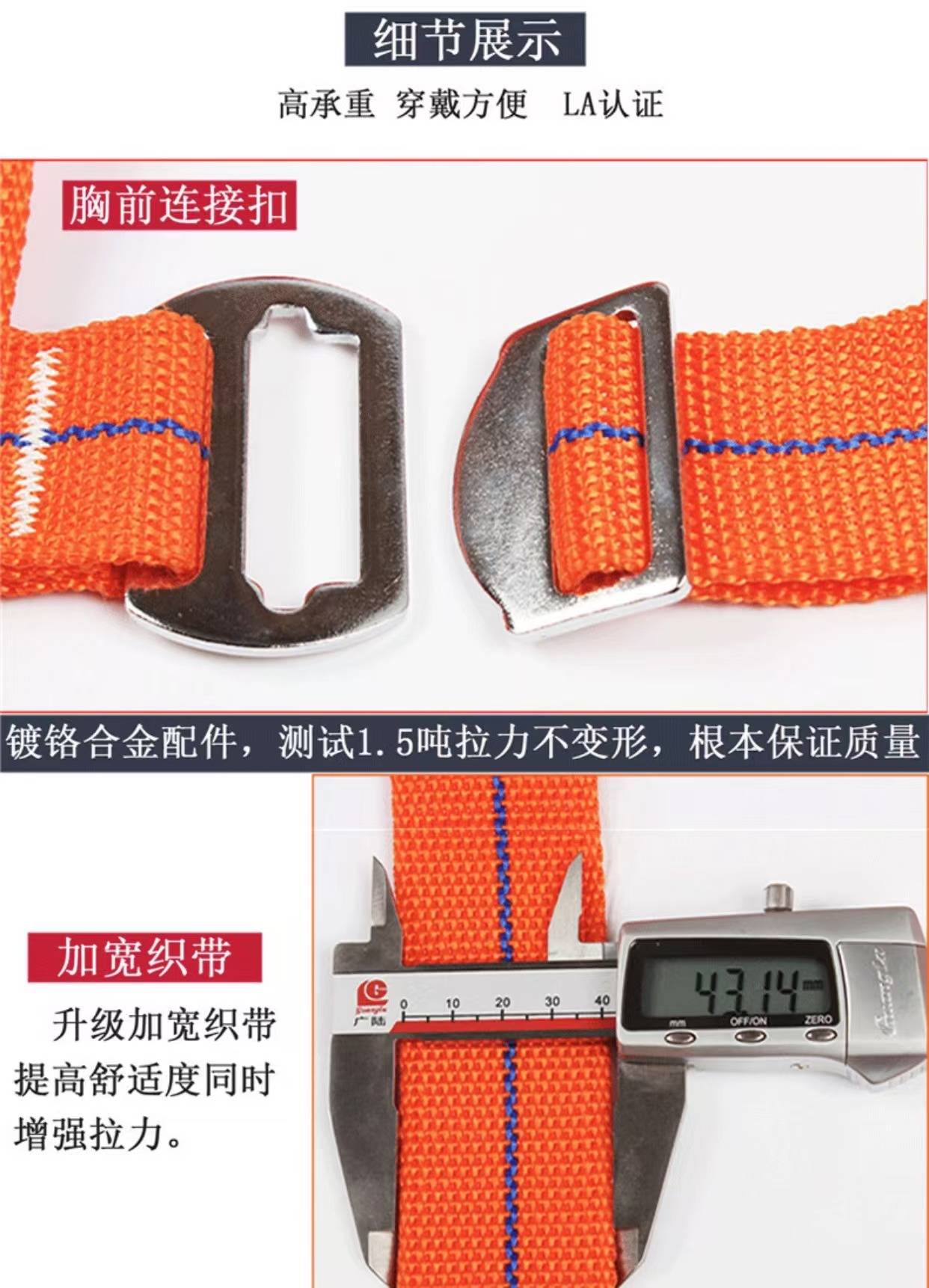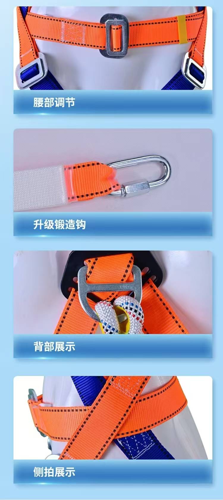 全身式安全带(Full Body Harness)是高空作业、工业攀爬、消防救援等场景中的核心防护装备,通过科学受力分布设计,将坠落冲击力分散到肩部、腿部及腰部,最大限度降低人体伤害风险。本产品严格符合**GB 6095-2021《坠落防护 安全带》国家标准,并通过EN 361(欧盟)、ANSI Z359.11(美国)等国际认证。产品特点:① 高强度防护结构、② 人性化设计、③ 多功能扩展接口、④ 智能安全升级。