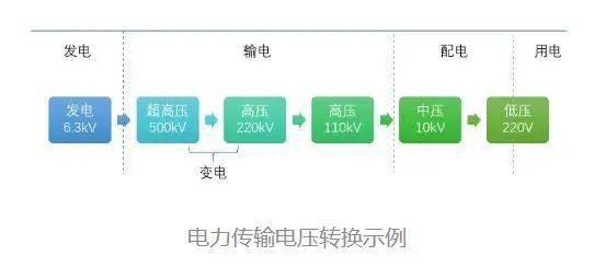 长距离送电那就会有发输变配用五个环节,也还是经济的原因。传输电力是有损耗的,其中有功损耗的基本公式为IR2,电流越大,发热越大,损耗越大,经济性越差,反之,电压越高,电流就越小,损耗就小,经济性好,所以远距离传输都要用高电压输电,发电站出厂后先升压至110kV~1000kV(根据距离远近),再长距离输送到城市、农村周边,再降压进入居民地带。