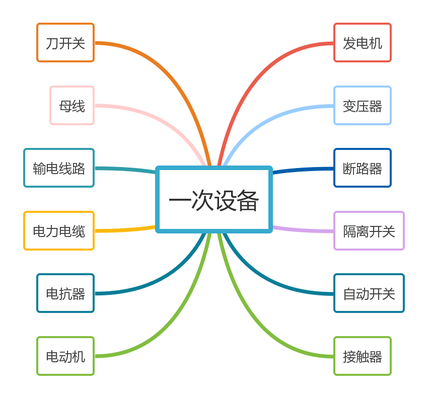 一次设备:指直接用于生产、输送和分配电能的生产过程的高压电气设备。它包括发电机、变压器、断路器、隔离开关、自动开关、接触器、刀开关、母线、输电线路、电力电缆、电抗器、电动机等。由一次设备相互连接,构成发电、输电、配电或进行其他生产过程的电气设备称为一次设备。