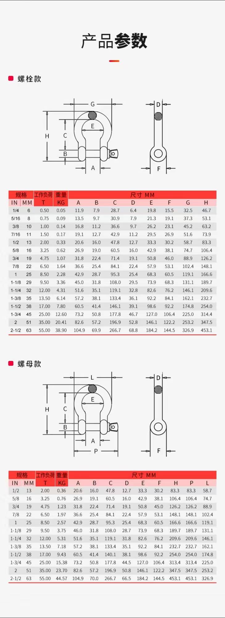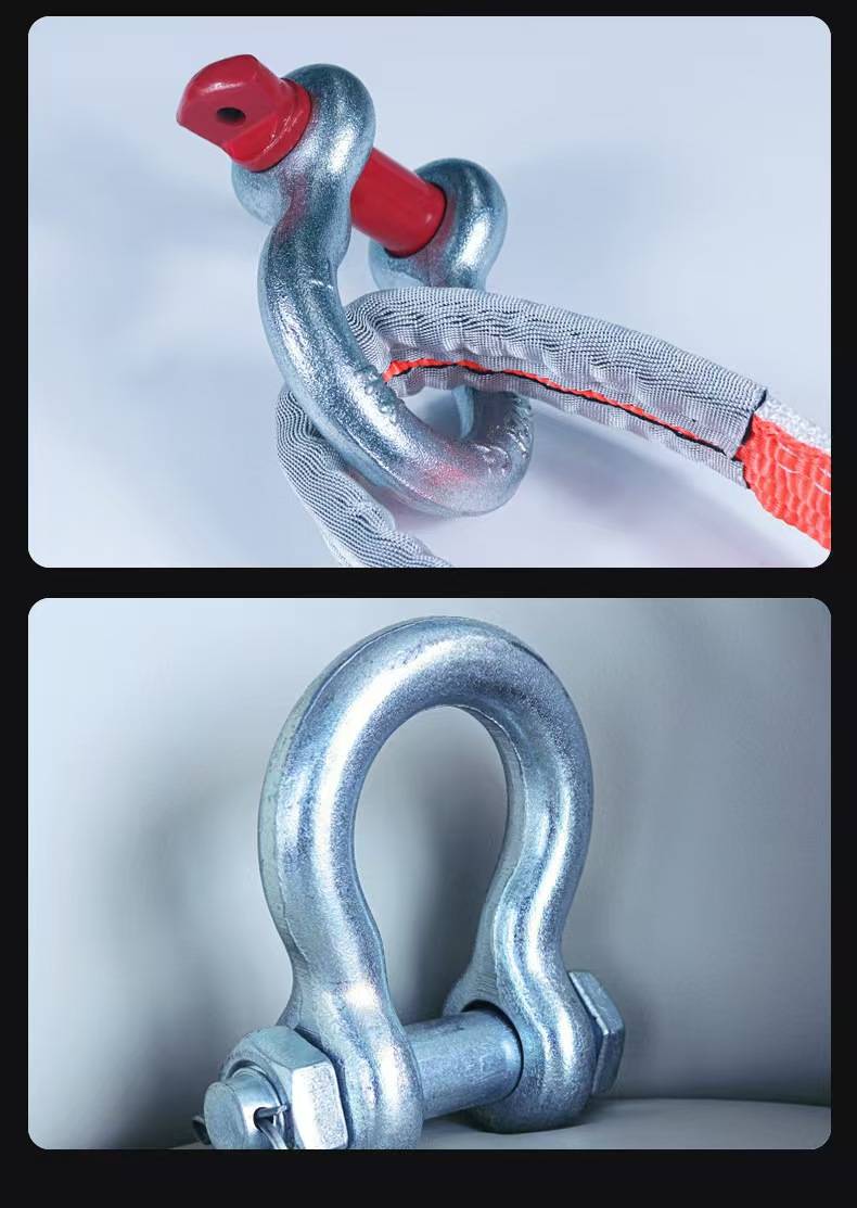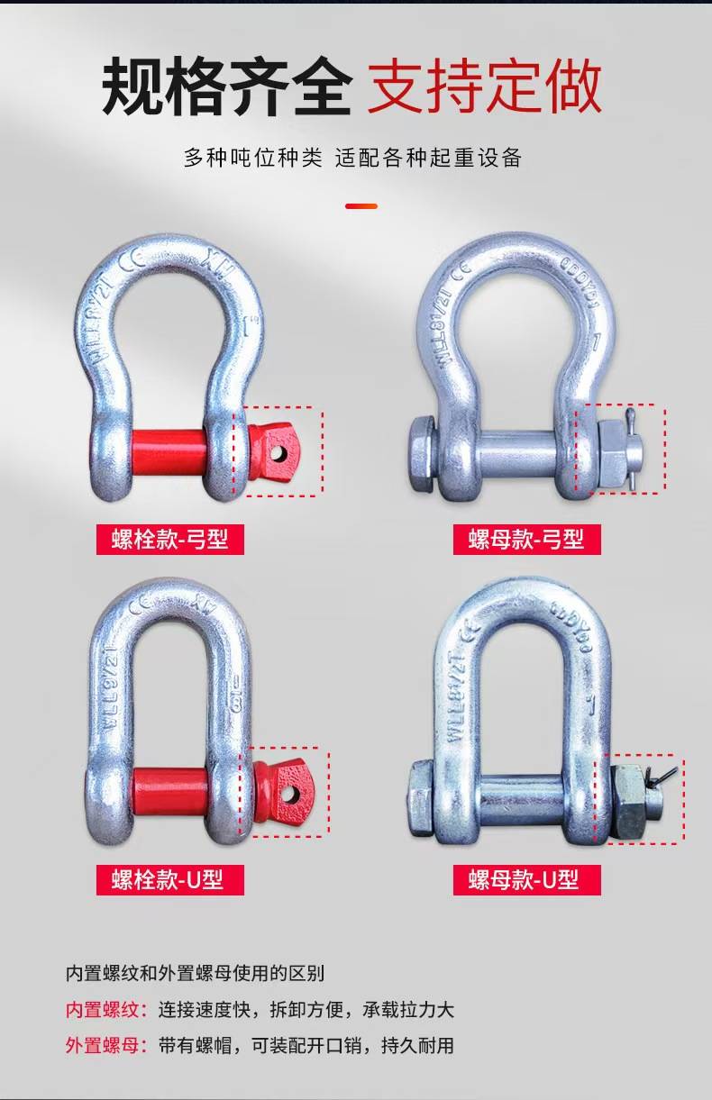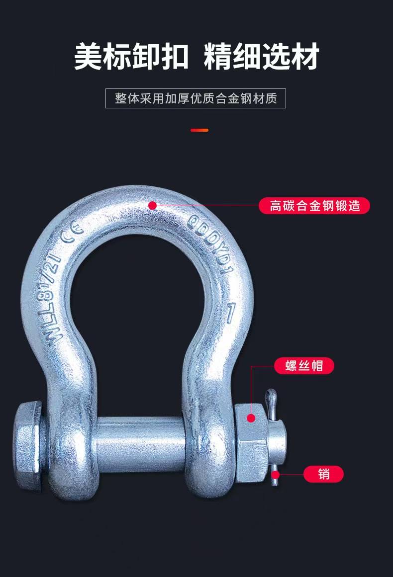 卸扣(又称吊环、连接扣、安全扣)是一种高强度金属连接件,广泛应用于起重、吊装、牵引、船舶、建筑及工业固定等领域。其核心作用是**安全承载负荷**,并灵活连接钢丝绳、链条、吊带等设备,确保作业稳定可靠。 核心特点:1. 高强度材质、2. 安全结构设计、 3. 灵活适配、 4. 标准化认证。