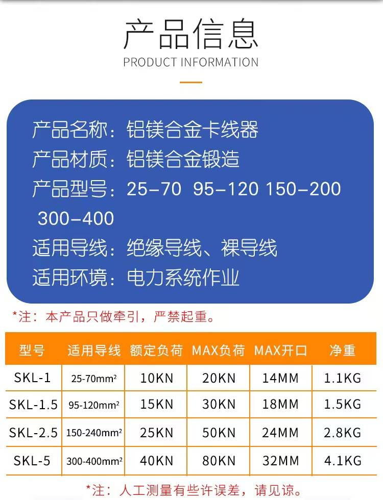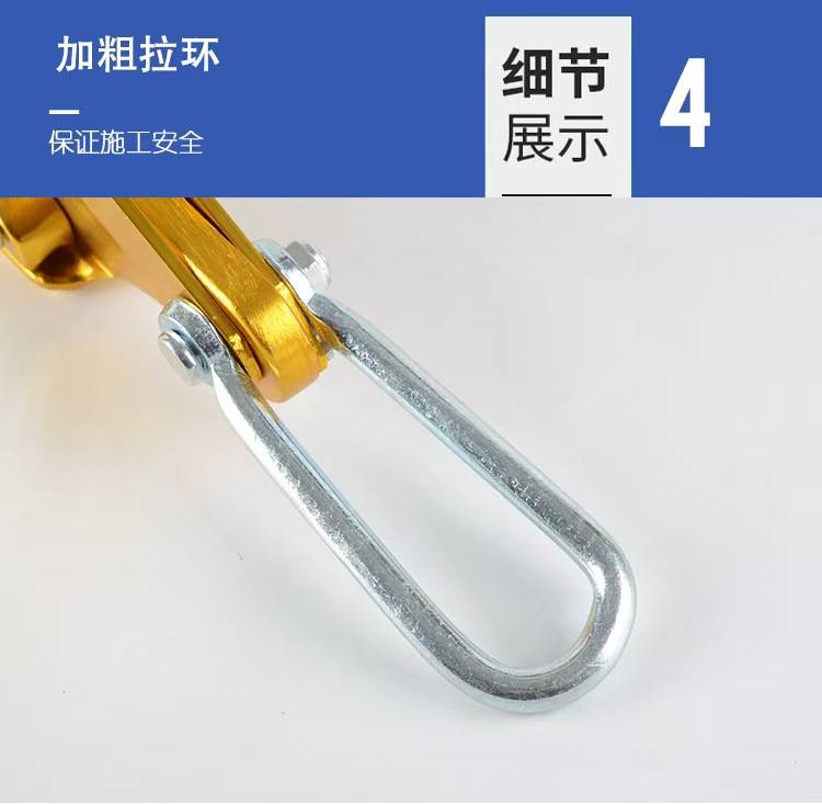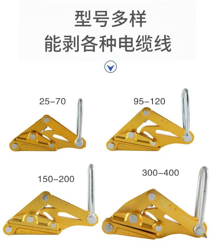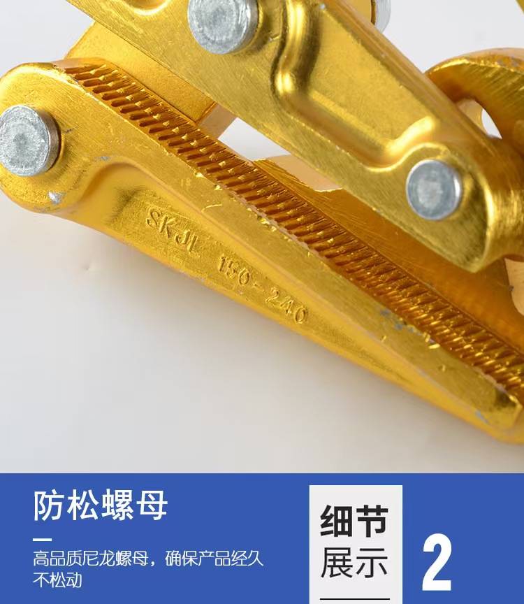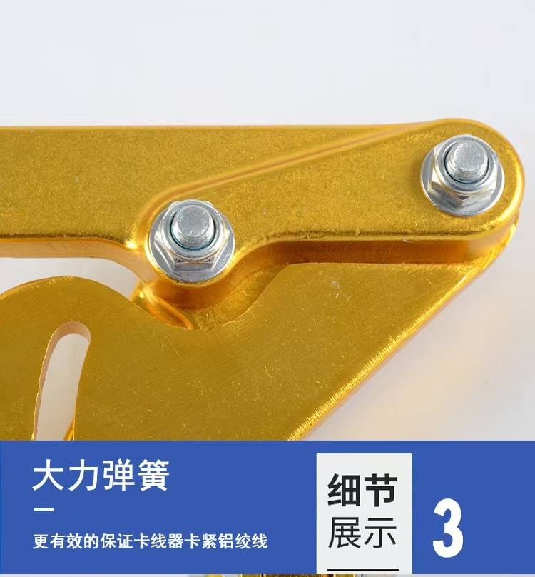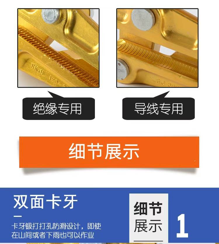 卡线器是一种专业电力施工工具,主要用于架空线路施工、维护时对导线或钢绞线进行夹持、牵引和固定。它能牢固抓握线缆而不损伤线体,是电力、通信、铁路接触网等高空作业的必备工具。2. 产品特点:强力夹持**:锯齿状合金钢夹块设计,最大可承受10吨拉力不打滑。无损保护:特殊橡胶衬垫保护导线绝缘层,避免压痕损伤。快速操作**:杠杆式/螺旋式锁紧机构,单手即可完成夹持释放 。轻量化:航空铝合金主体,重量比传统工具减轻40% 。安全可靠:通过GB/T 18269-2008标准测试,含双重防脱保险。全天候适用:-30℃~80℃环境正常使用,防锈防腐蚀处理 。