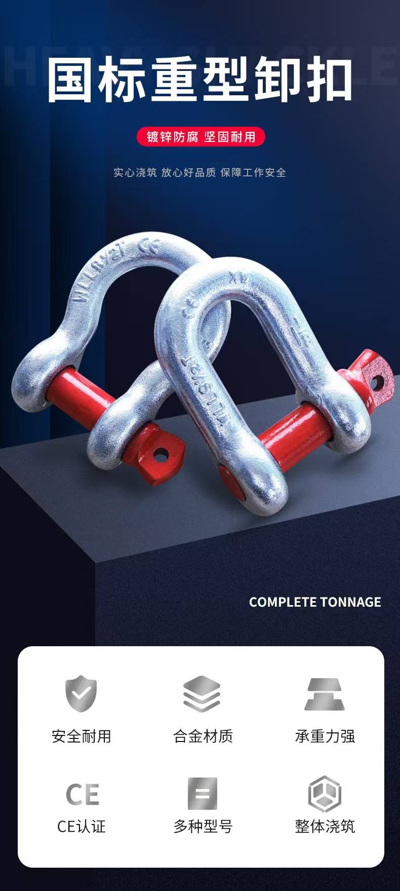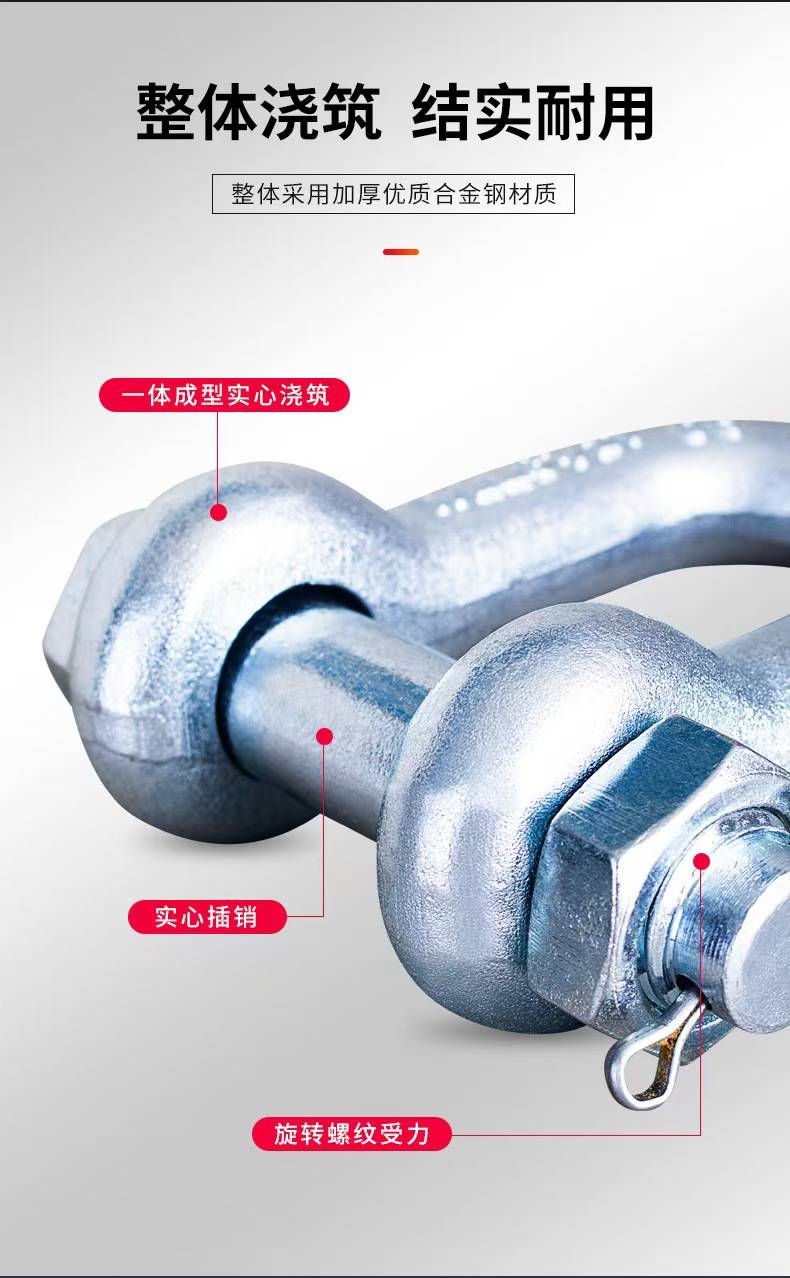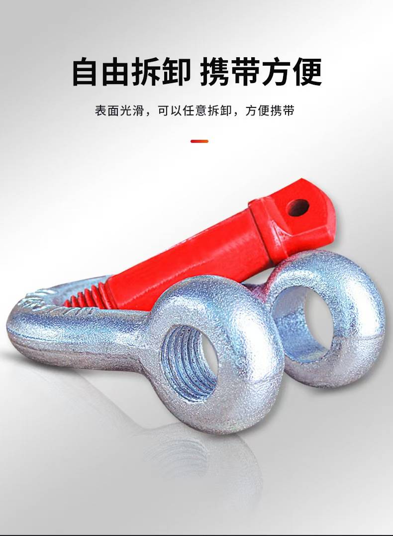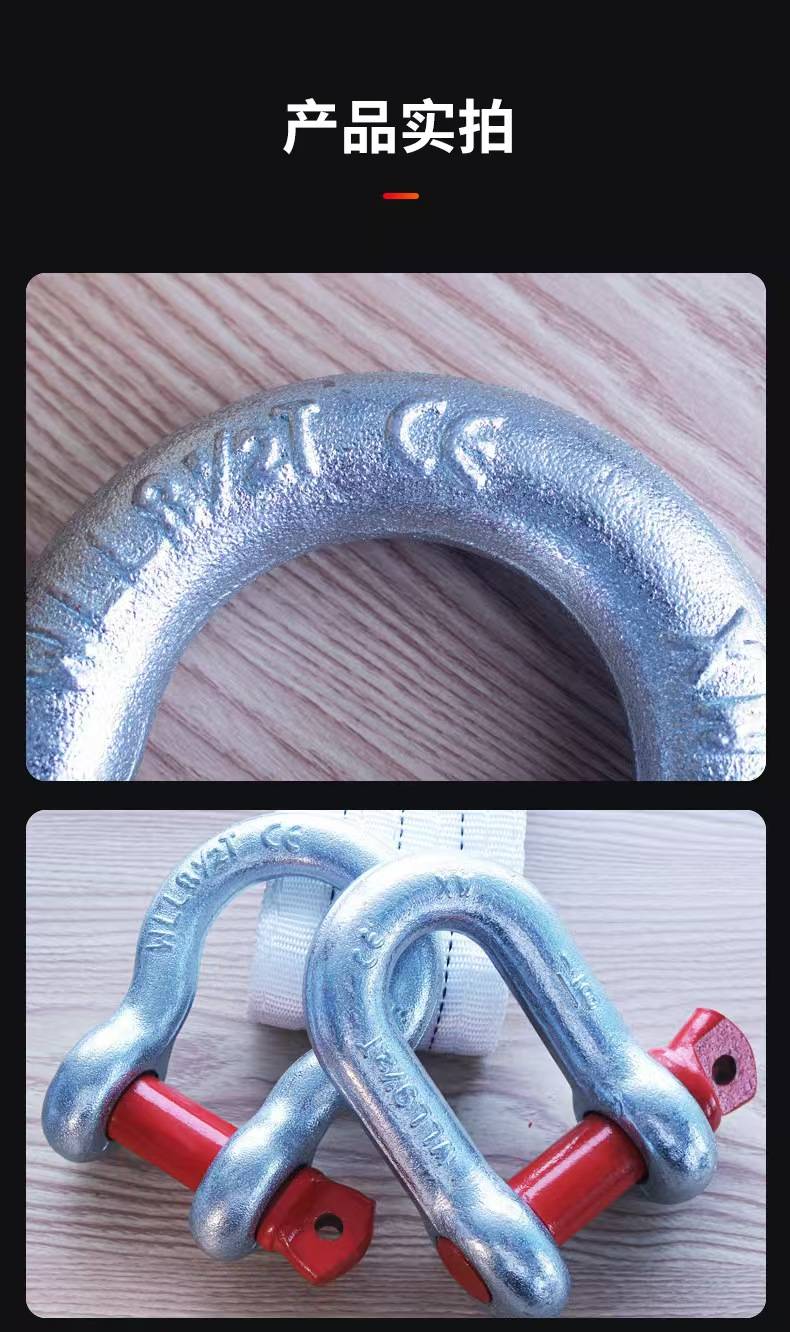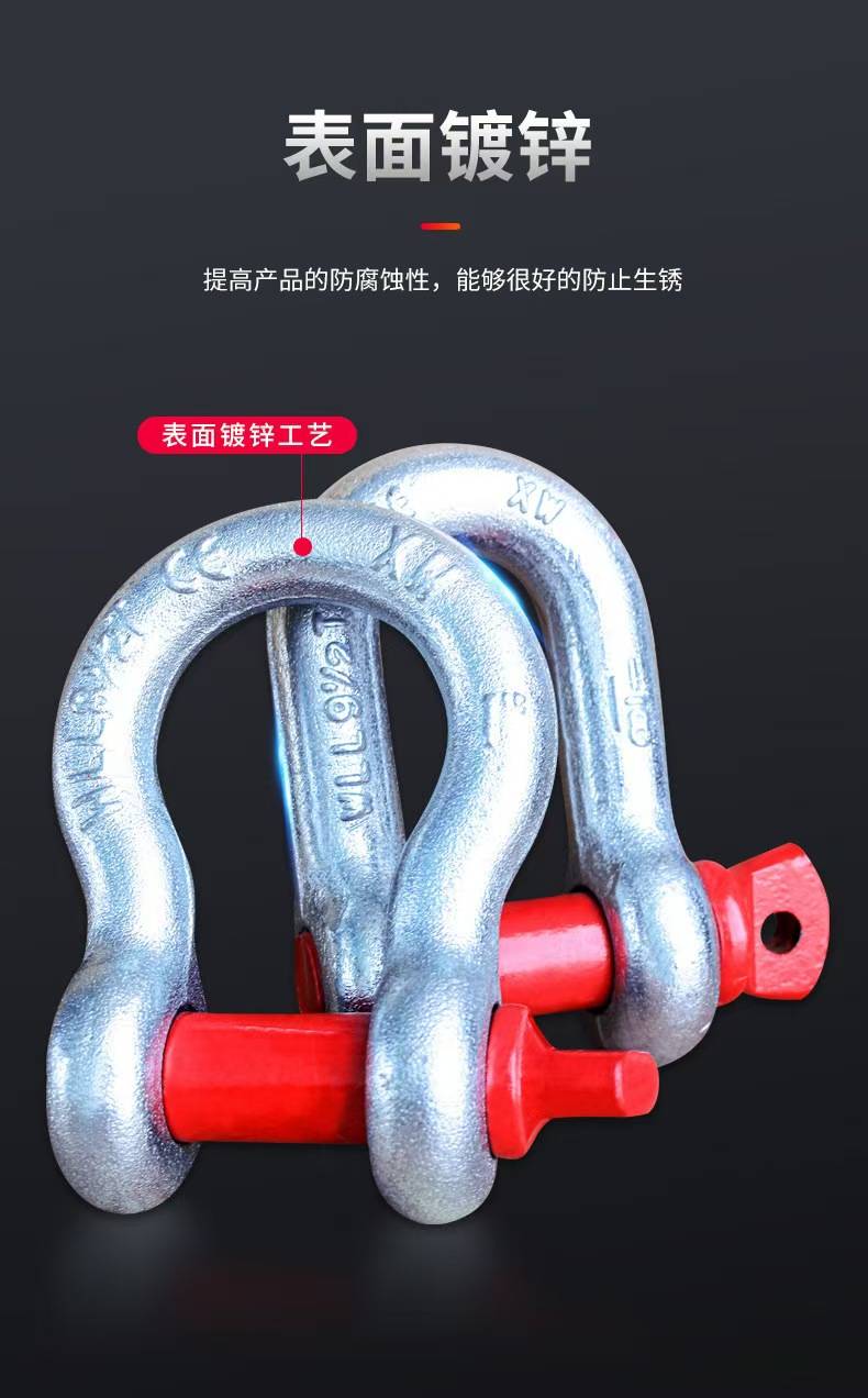 卸扣(又称卸甲、卡环、连接环)是一种高强度、可拆卸的连接件,广泛应用于起重、吊装、船舶、电力、建筑、运输等领域。其核心功能是**安全连接钢丝绳、吊带、链条等索具,并承受重载拉力,是各类工程作业中的关键受力部件。2. 产品特点:高强度材质:采用合金钢、不锈钢或碳钢锻造,经热处理后具有高抗拉强度和耐磨性。安全可靠:符合ISO 2415、GB/T 25854、ASME B30.26等国际标准,额定载荷清晰标注,确保安全使用。多种类型可选:包括弓形(D型)卸扣、U型(Omega型)卸扣、锚型卸扣等,适应不同工况需求。防腐耐用:表面处理包括镀锌、镀镍、喷塑或不锈钢抛光,适用于潮湿、海洋等腐蚀环境。 易装卸:螺纹销轴或螺栓设计,便于快速连接和拆卸。