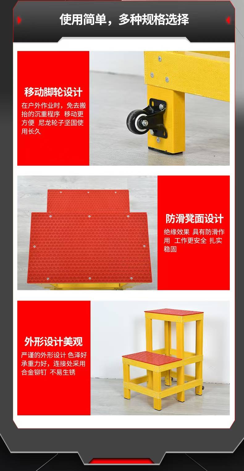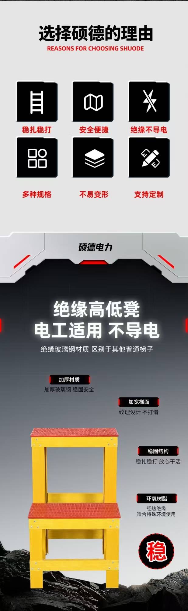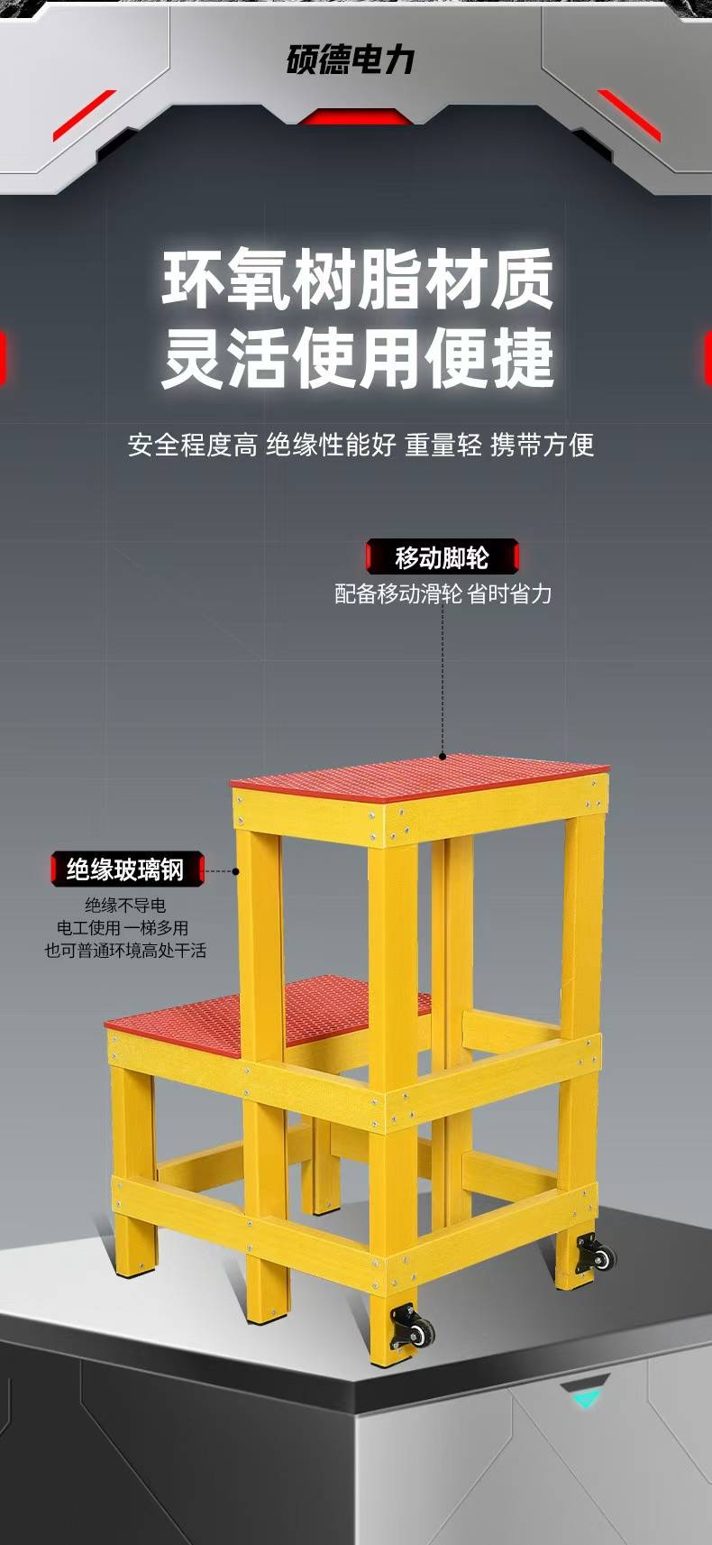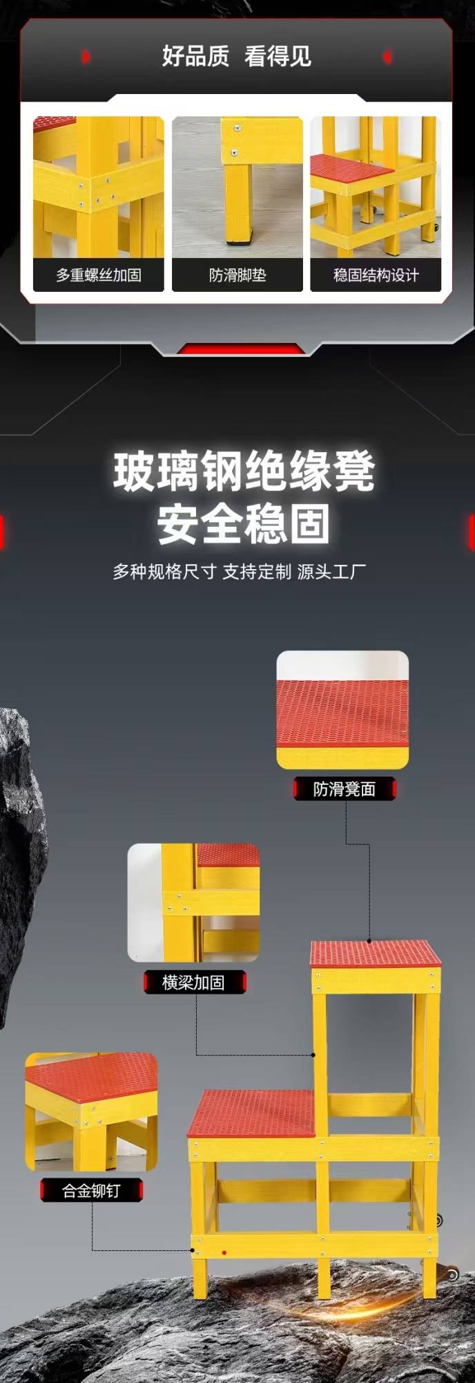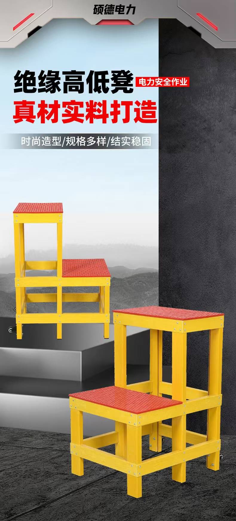 绝缘凳产品介绍:绝缘凳(又称电工绝缘凳、高压绝缘凳)是一种专为电力作业、电气维修等场景设计的安全登高工具,采用高强度绝缘材料制成,能有效防止电流传导,保障作业人员的安全。适用于变电站、配电室、电力抢修等需要防触电的作业环境。 产品特点:1. 高绝缘性能 、2. 高强度 & 轻量化 3. 安全防护设计、4. 耐候 & 耐腐蚀。